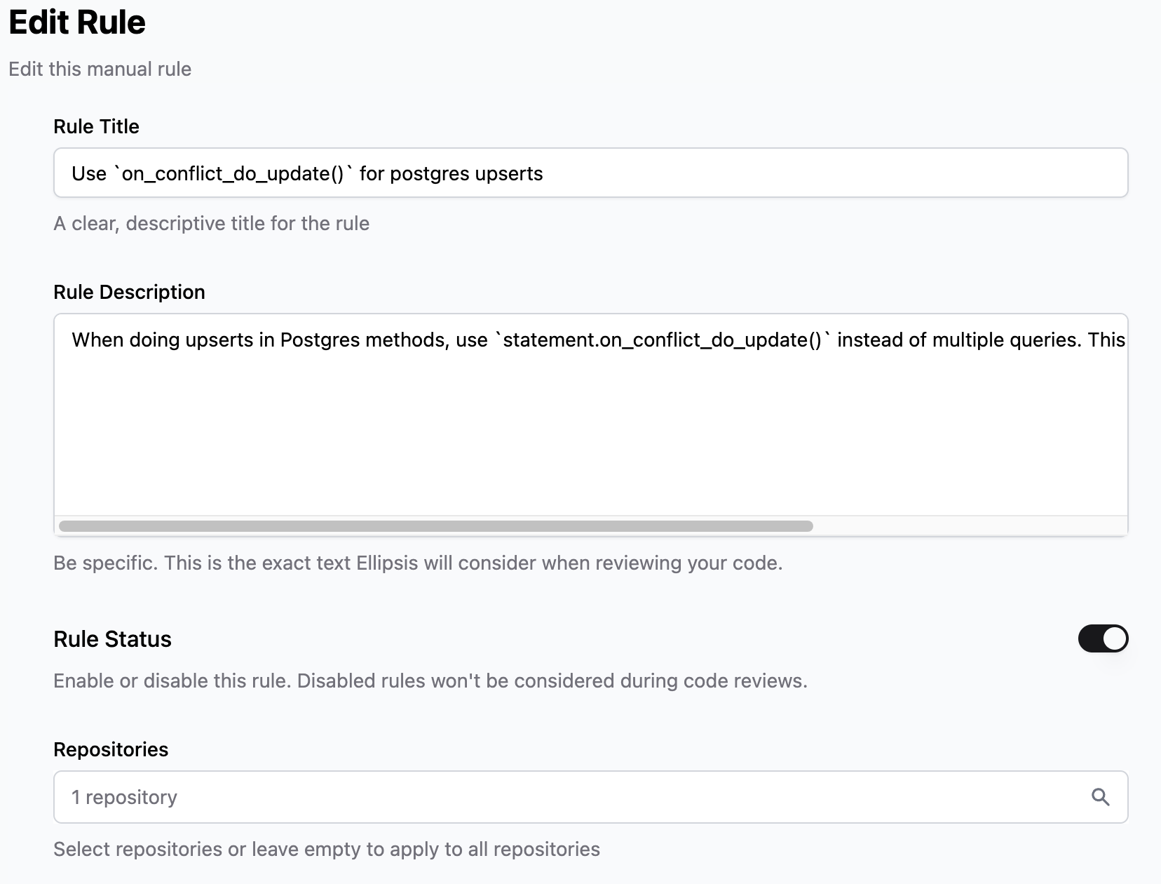 Use rules to enforce your team style guide. For example, you might add a rule like βMake sure new code has corresponding unit tests.β Ellipsis will subsequently leave reminders on any pull requests that try to submit untested code. Rules can be added manually in the UI, but Ellipsis will also infer rules from historical comments. Rules can also be extracted from style guide files in the repository itself. This allows you to keep your style guide up to date without having to manually update the rules in our web app. Rules can apply only to certain files or certain directories/file paths within the repository.