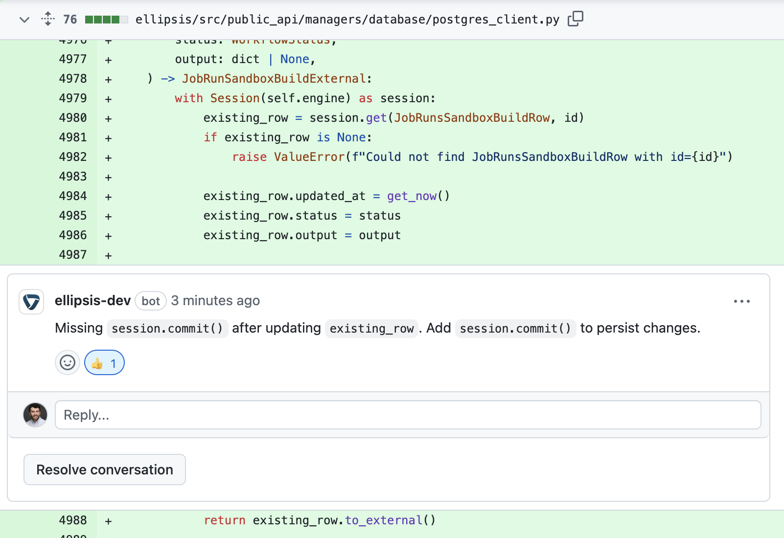 Ellipsis will learn from your feedback to improve future reviews. To educate Ellipsis, you can react to a review comment with π or π, or even reply to the comment with specific feedback.
