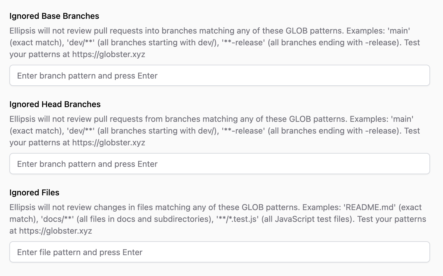 You can configure Ellipsis to ignore certain branches, files, and paths. Use this to avoid reviewing code that you donβt care about.